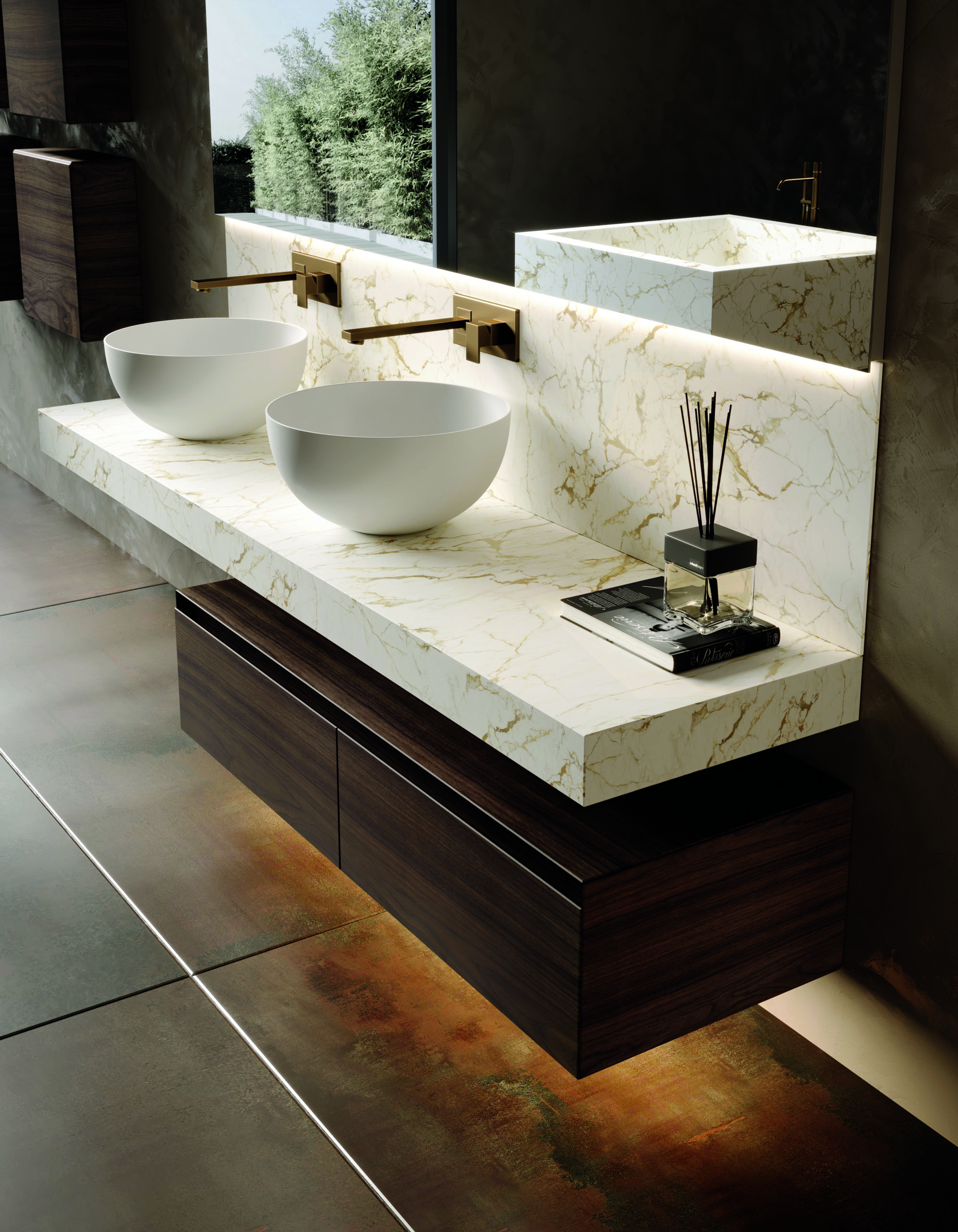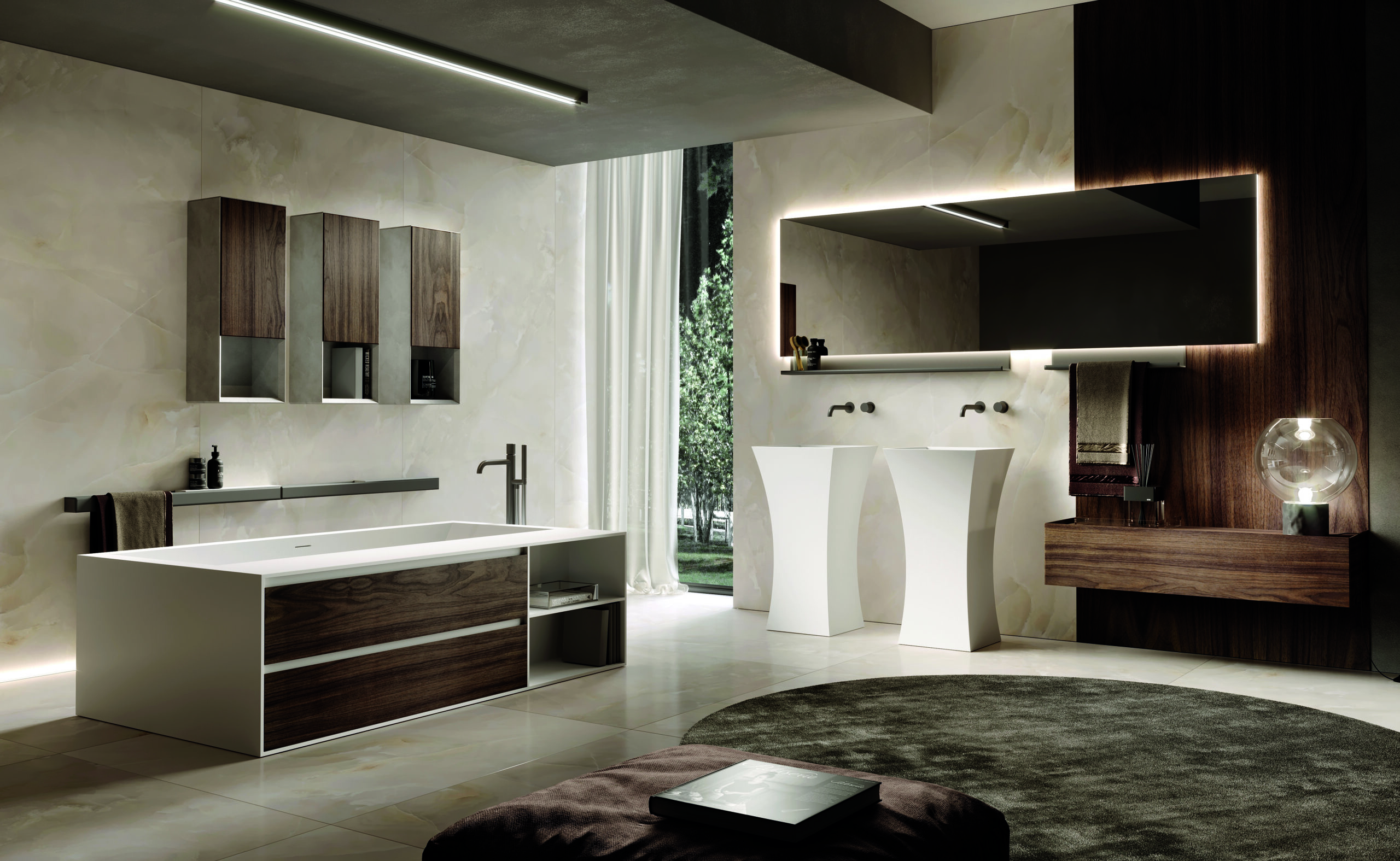 The Mood collection was conceived as a modular line featuring an 18 mm water-resistant white melamine inner cabinet.